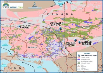 The Mazerac Property is located approximately 30 km east of Power Metals' Decelles property near well-established mining camps in the Abitibi region of Canada and is accessible by network of mining-grade forestry roads. The Mazerac property contains 259 claims that cover 14,700 hectares of LCT prospective ground near the mining center of Val-dÓr and Rouyn-Noranda. The regional geology of Mazerac is similar to Decelles where S-type LCT prospective, pegmatite bearing, granites of Decelles Batholith intrude into metasedimentary units of the Pontiac Group. Spodumene and Beryl bearing pegmatites have been reported historically within the Pontiac sub-province in association with S-type garnet-muscovite granite (Figure 5).